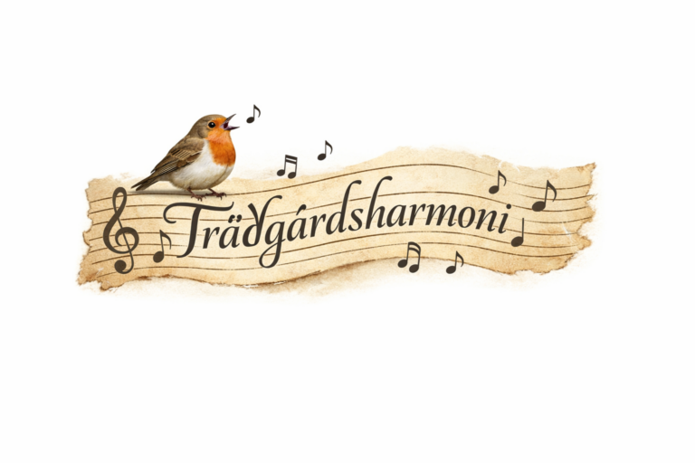 Samtidigt såg jag en bild inom mig – en notrad på ett gammalt, gulnat papper som rör sig i vinden. Noter som delvis släpper taget, och där namnet Trädgårdsharmoni tar deras plats. En liten rödhake sätter sig på pappret och sjunger.